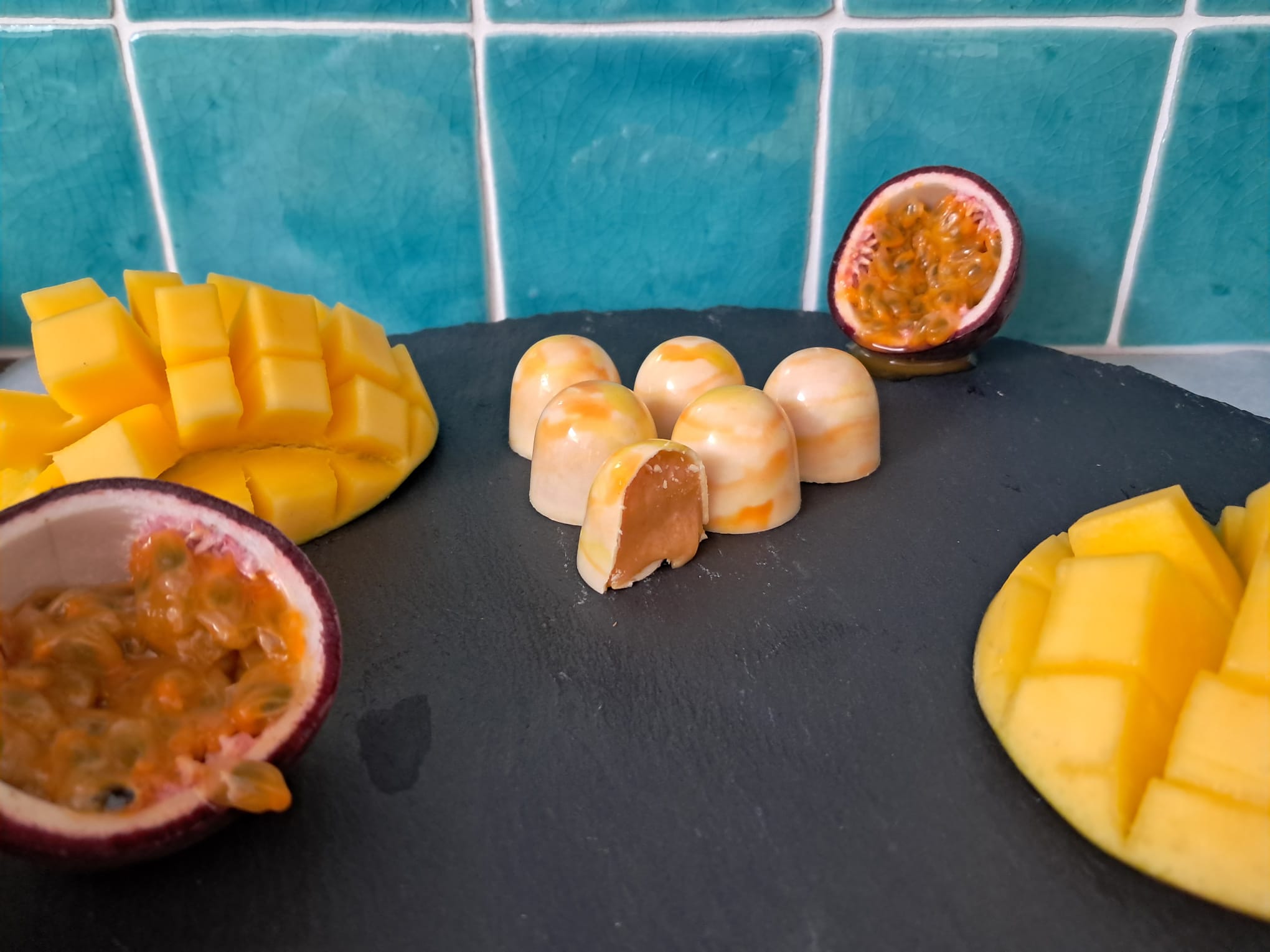 Een knapperige witte chocolade bonbon gevuld met een fris zoete mango-passie vulling.